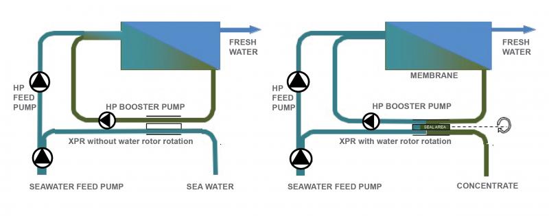 After passing the sealing area, the ducts enters the low pressure side where seawater flows in the opposite direction, forcing the concentrate back out to the sea at atmospheric pressure. The ducts are then filled with seawater before entering the second sealing area that stops the flow inside the ducts before entering the high pressure side. Here the concentrate is allowed to push out the seawater at about 855 PSI towards the booster pump that increases the pressure to the necessary membrane feed pressure of 900 PSI.